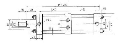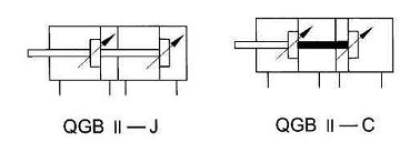 *兩種均為QGB||系列相同缸徑的氣缸串聯(lián)而成的雙活塞氣缸,兩活塞運(yùn)動(dòng)方向相同。